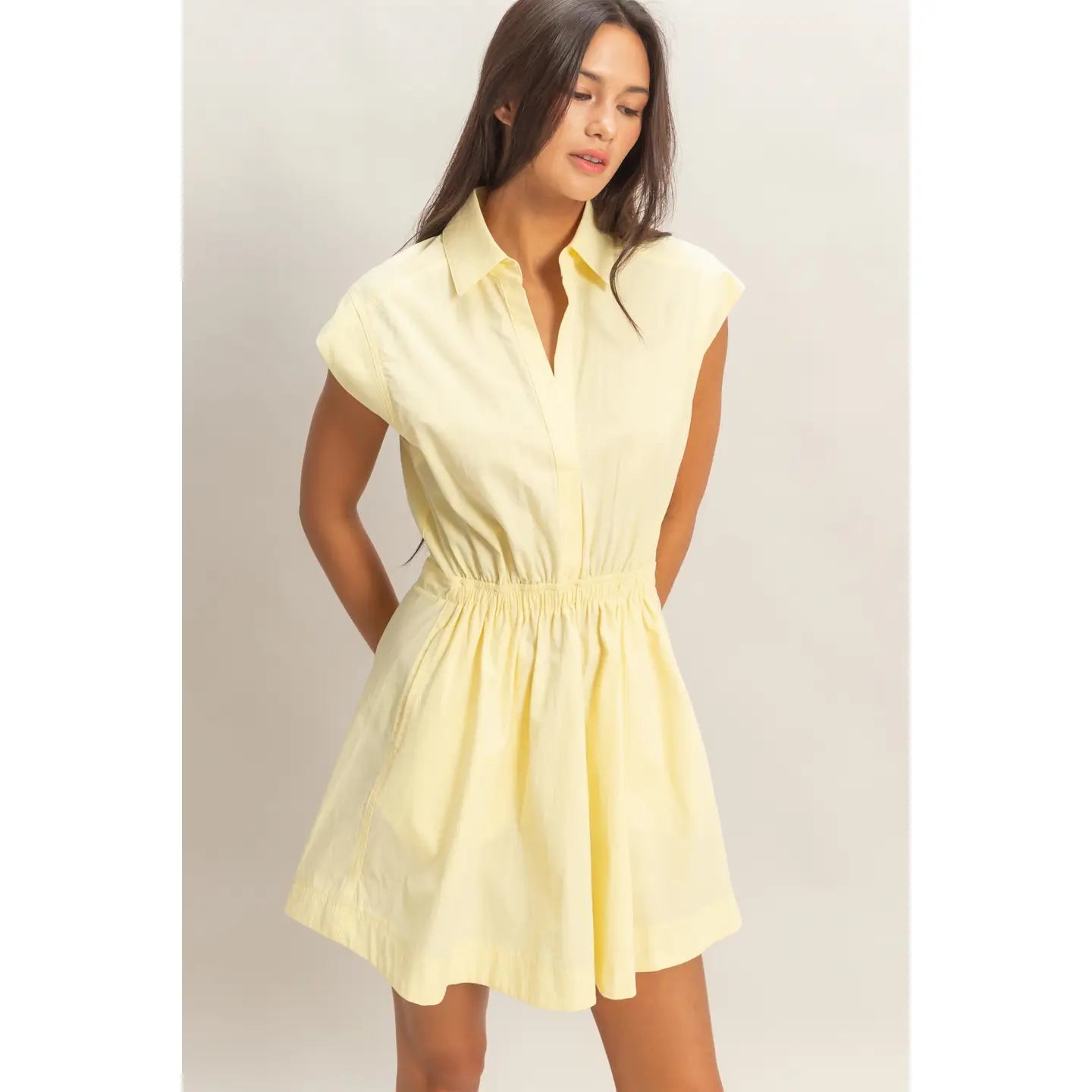 Effortless summer style meets everyday comfort in this sleeveless collared mini dress. Crafted from 100% cotton, it features a flattering shirred silhouette that skims the body, a crisp collared neckline, and an elastic waist for an adjustable fit. Practical side pockets and a buttonless placket complete the design. Perfect for warm-weather outings, casual gatherings, or layering with your favorite accessories.