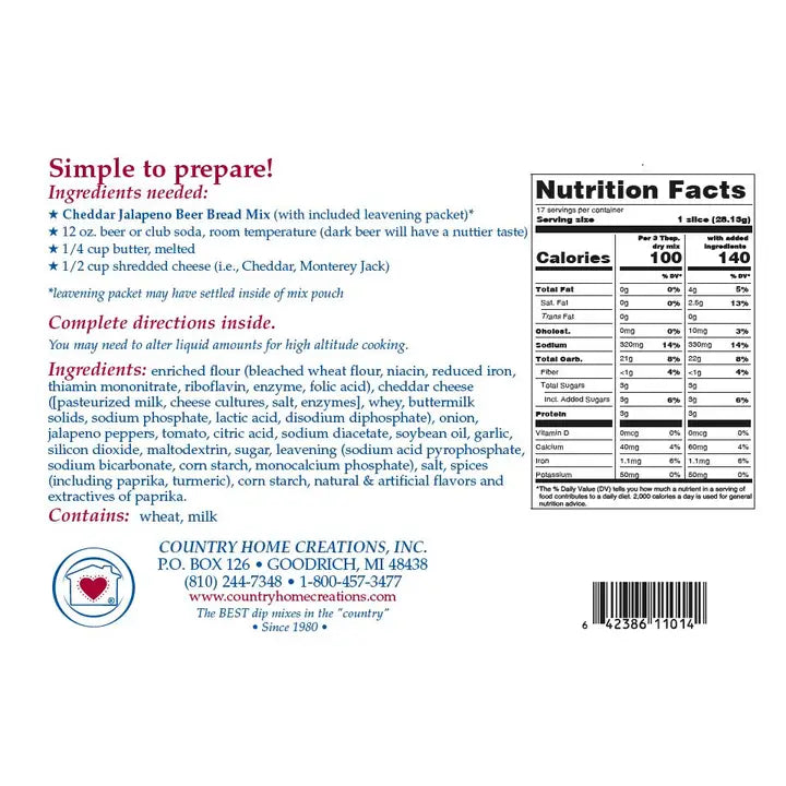 Cheddar Jalapeno Beer Bread Mix combines rich cheddar with a hint of jalapeno for a perfectly balanced flavor that’s both savory and mildly spicy. Simply add butter and 12 oz. of your preferred beer or carbonated drink to create a moist, flavorful bread that complements chili, wings, or your favorite dinner dishes. This easy-to-make mix offers a gourmet touch with minimal effort, ideal for those seeking a distinctive homemade bread experience.
