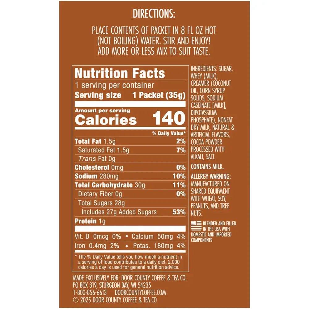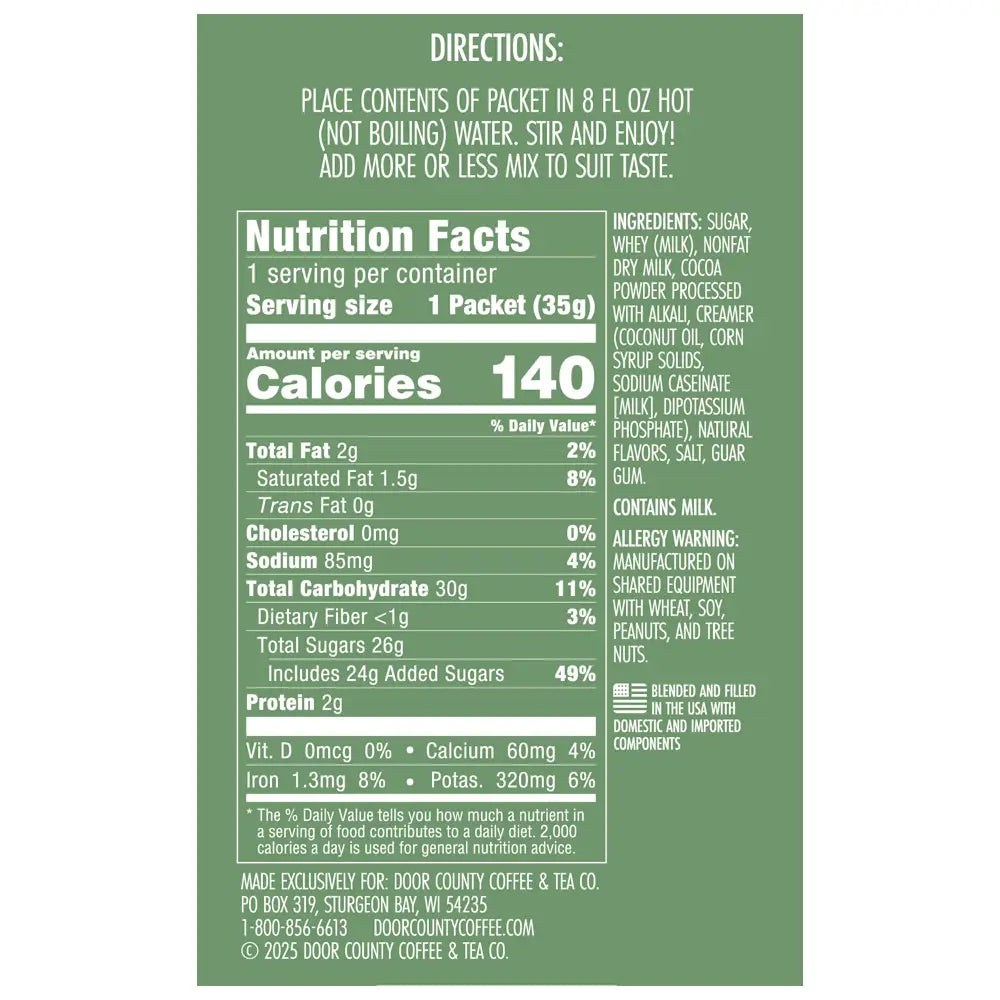 Door County Gourmet Hot Cocoa delivers rich, indulgent flavor in a convenient single-serving packet. This premium blend combines quality cocoa with carefully selected ingredients to create a luxurious hot chocolate experience. Simply add hot water to enjoy a velvety, satisfying cup that rivals café-quality beverages. Perfect for cozy evenings, gift-giving, or stocking your pantry with an elevated comfort beverage. Each packet ensures consistent, delicious results every time.