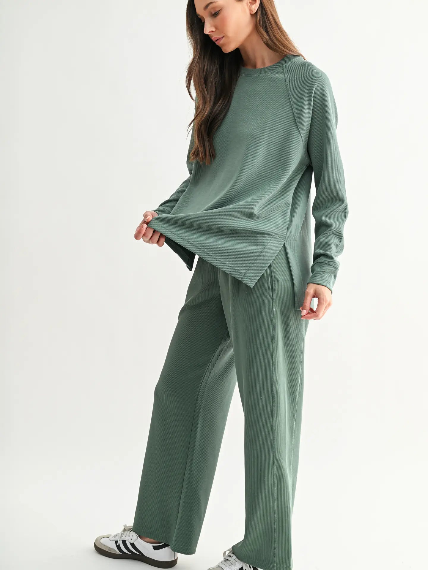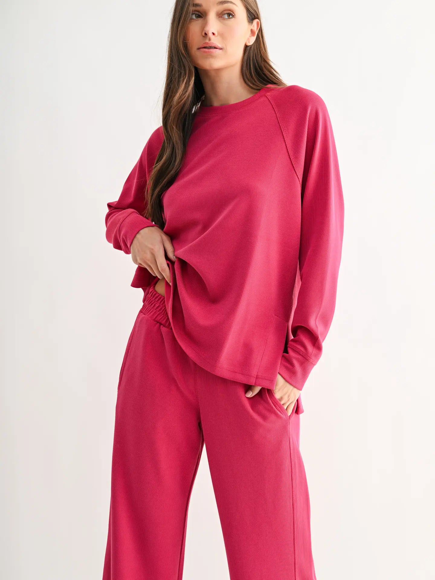 A modern staple with an effortless drape, this long sleeve tee is crafted from buttery-soft, sand-washed rib fabric. Featuring a classic crew neckline and raglan sleeves, it’s designed with side slits and a high-low hem for ease and movement. The perfect blend of comfort and casual polish, it’s made to wear on repeat.